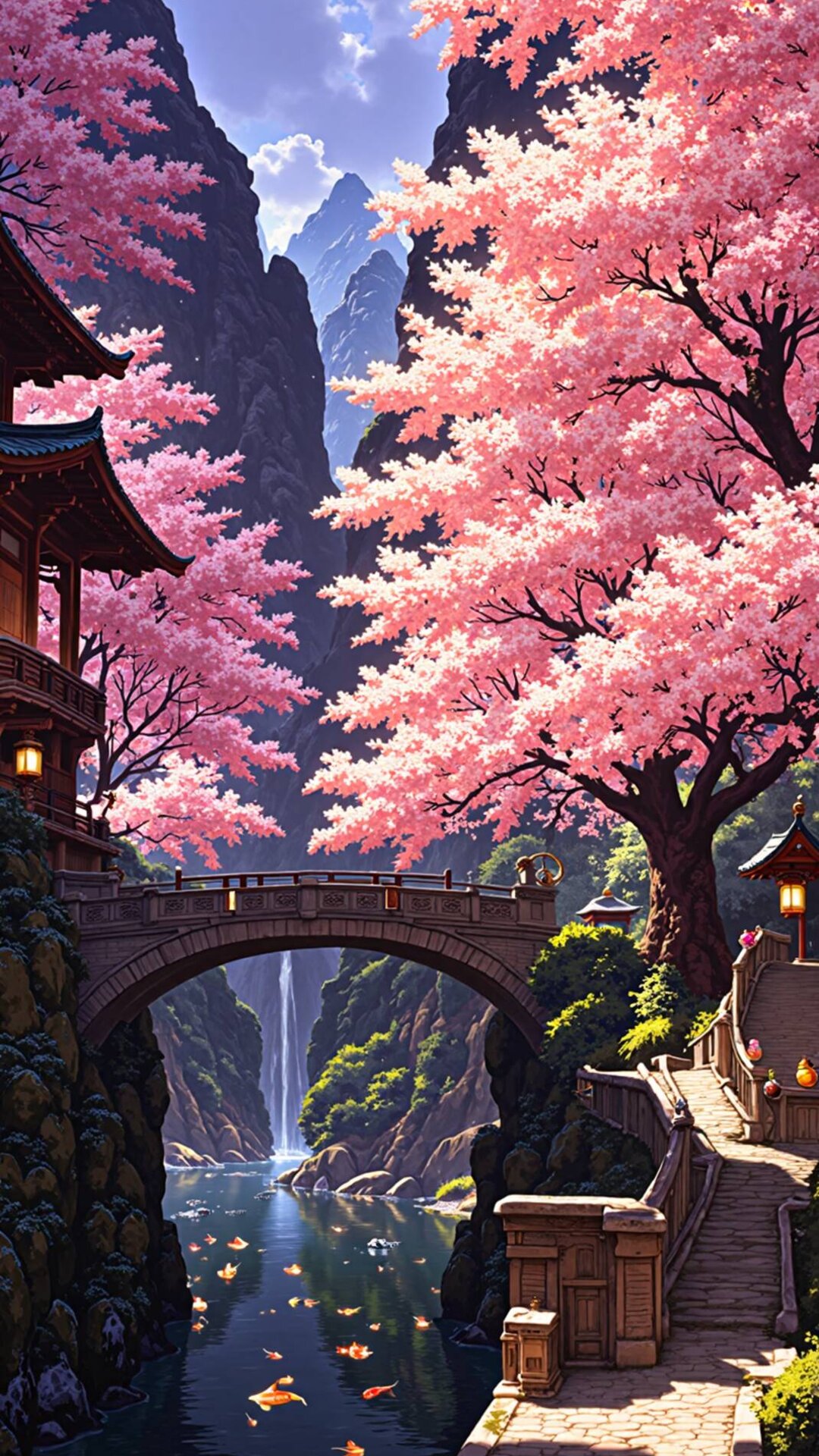 Cherry Blossom Mountain Waterfall Dreamscape