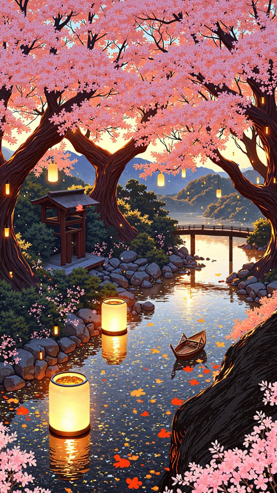 Immerse yourself in this breathtaking vision of Japanese tranquility. The abundant cherry blossoms frame a serene river, reflecting the warm glow of lanterns. This piece captures the perfect mood of 'golden hour' transitioning into twilight, evoking a nostalgic and peaceful vibe. It is a beautiful reminder that 'Blissful Scapes' are found in moments of natural beauty, making it a perfect fit for mobile home screens.