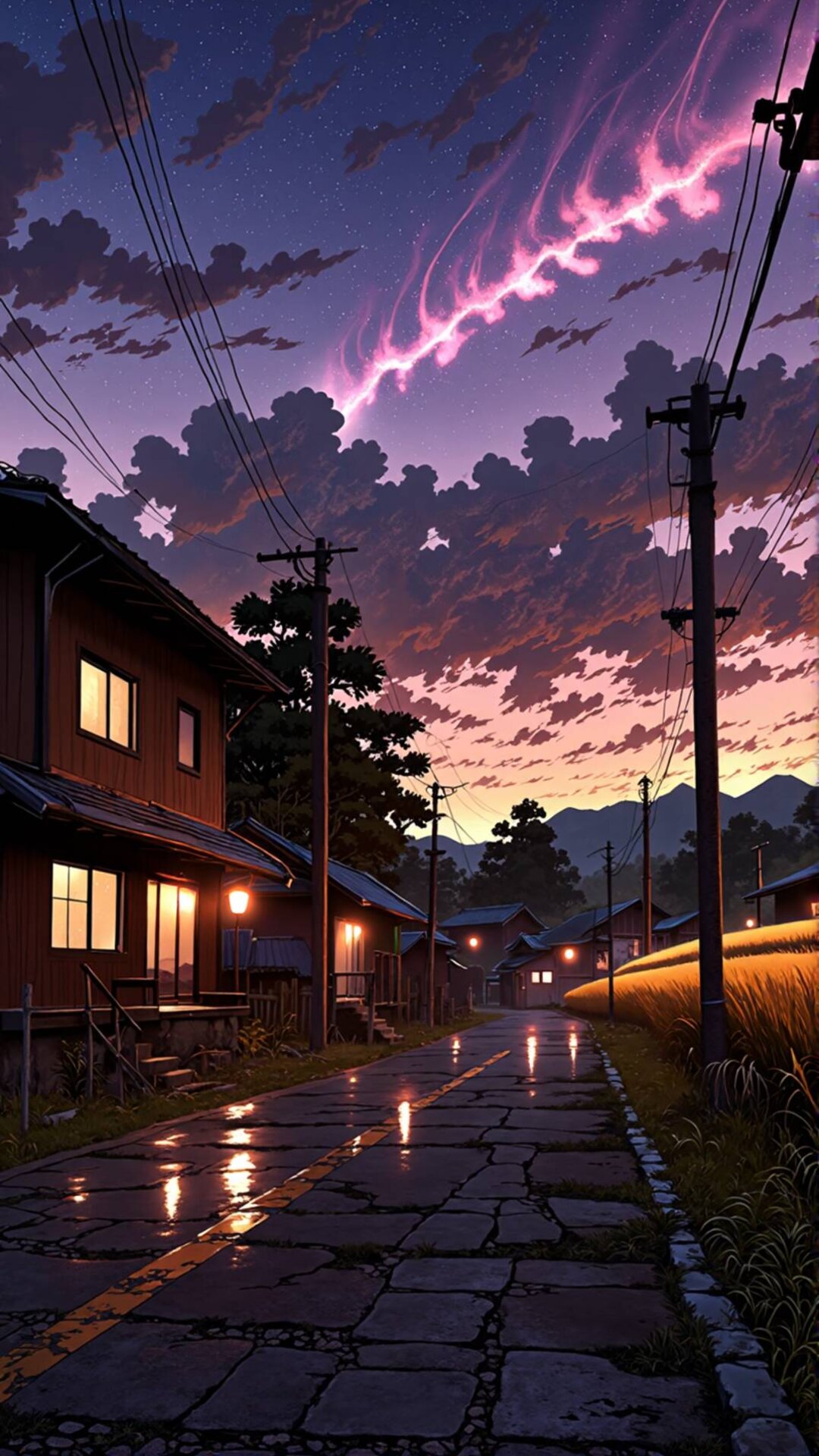 Experience the breathtaking beauty of Blissful Scapes with this dramatic streetscape. The image captures a deeply nostalgic vibe during the golden hour, featuring glowing wooden homes lining a wet path. The sky is filled with dramatic, swirling pink and purple clouds, making it a stunning piece. This atmospheric scene is a perfect fit for mobile home screens.