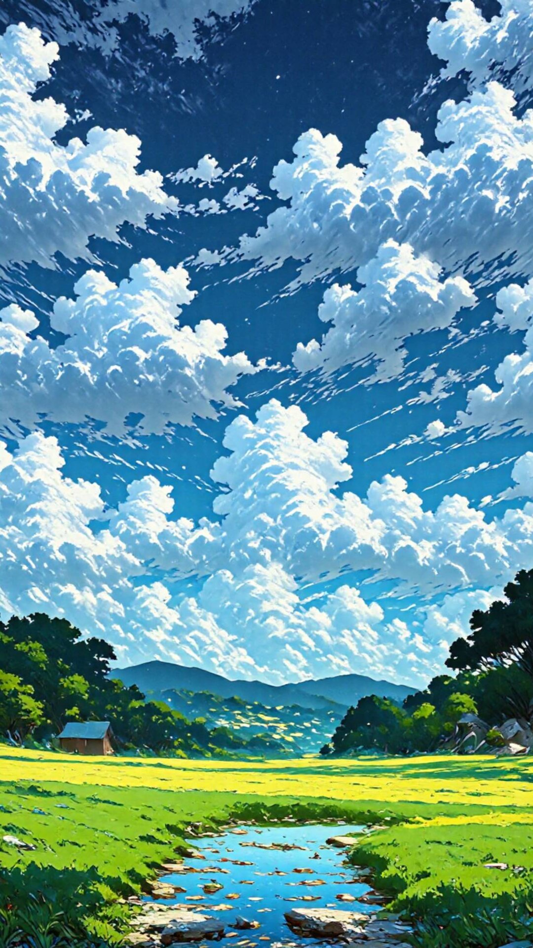 Experience the perfect mobile home screen view with this breathtaking illustration. The 'Blissful Scapes' capturing a magnificent day under dramatic, voluminous clouds and endless blue. The golden light bathes the vibrant green fields, which meet a tranquil, reflective stream. This scene evokes an epic adventure and a deeply nostalgic, peaceful vibe. It's a visually stunning blend of natural grandeur and serene beauty.