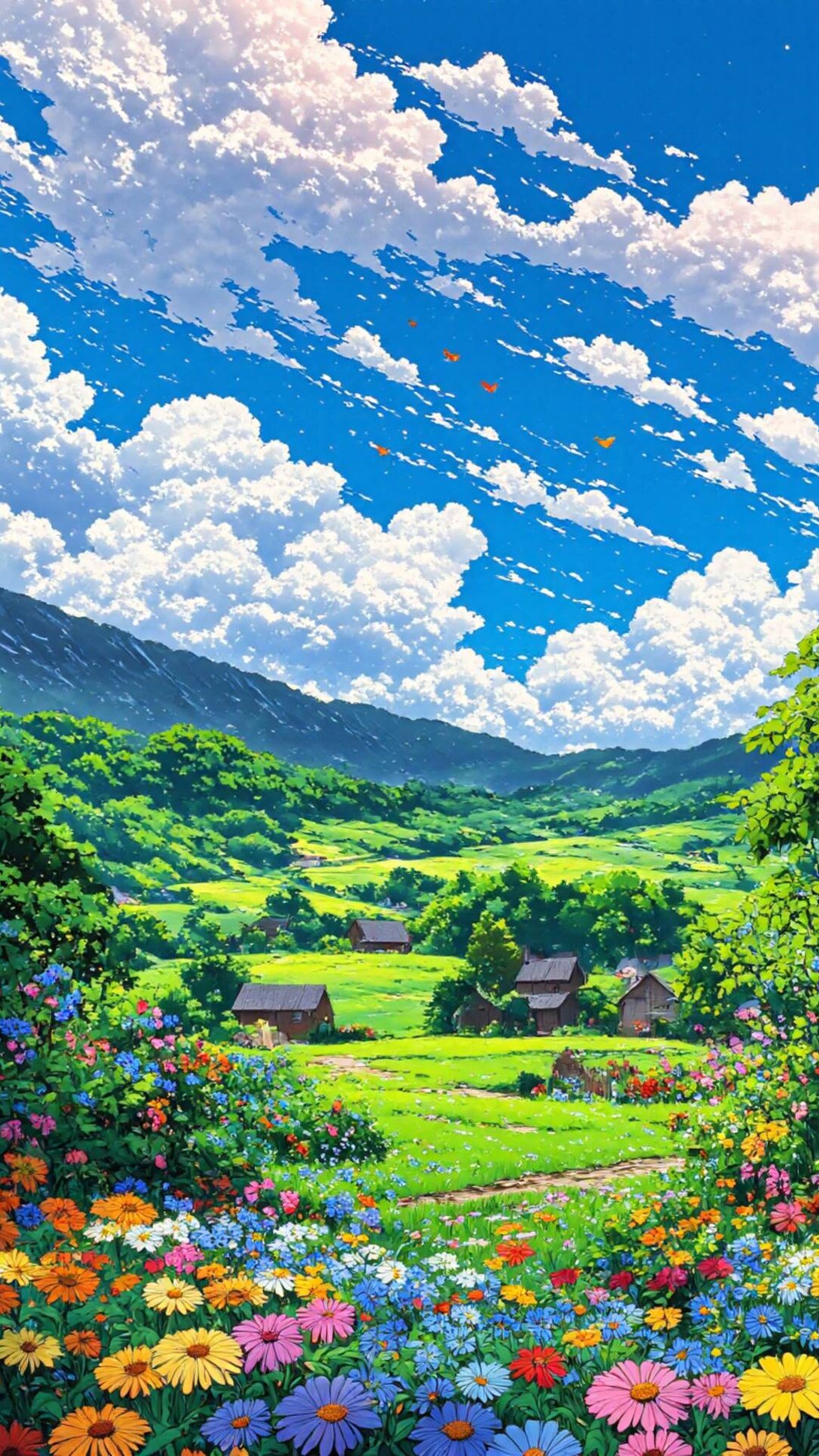 Experience the ultimate escape with this vibrant piece capturing the essence of Blissful Scapes. The scene features rolling emerald hills, charming rustic houses nestled among lush greenery, and a tapestry of colorful wildflowers in the foreground. Dramatic cumulus clouds dominate the bright blue sky, suggesting a perfect sunny day under golden hour lighting. The overall vibe is breathtakingly tranquil and nostalgic, making it an ideal, vibrant fit for mobile home screens.