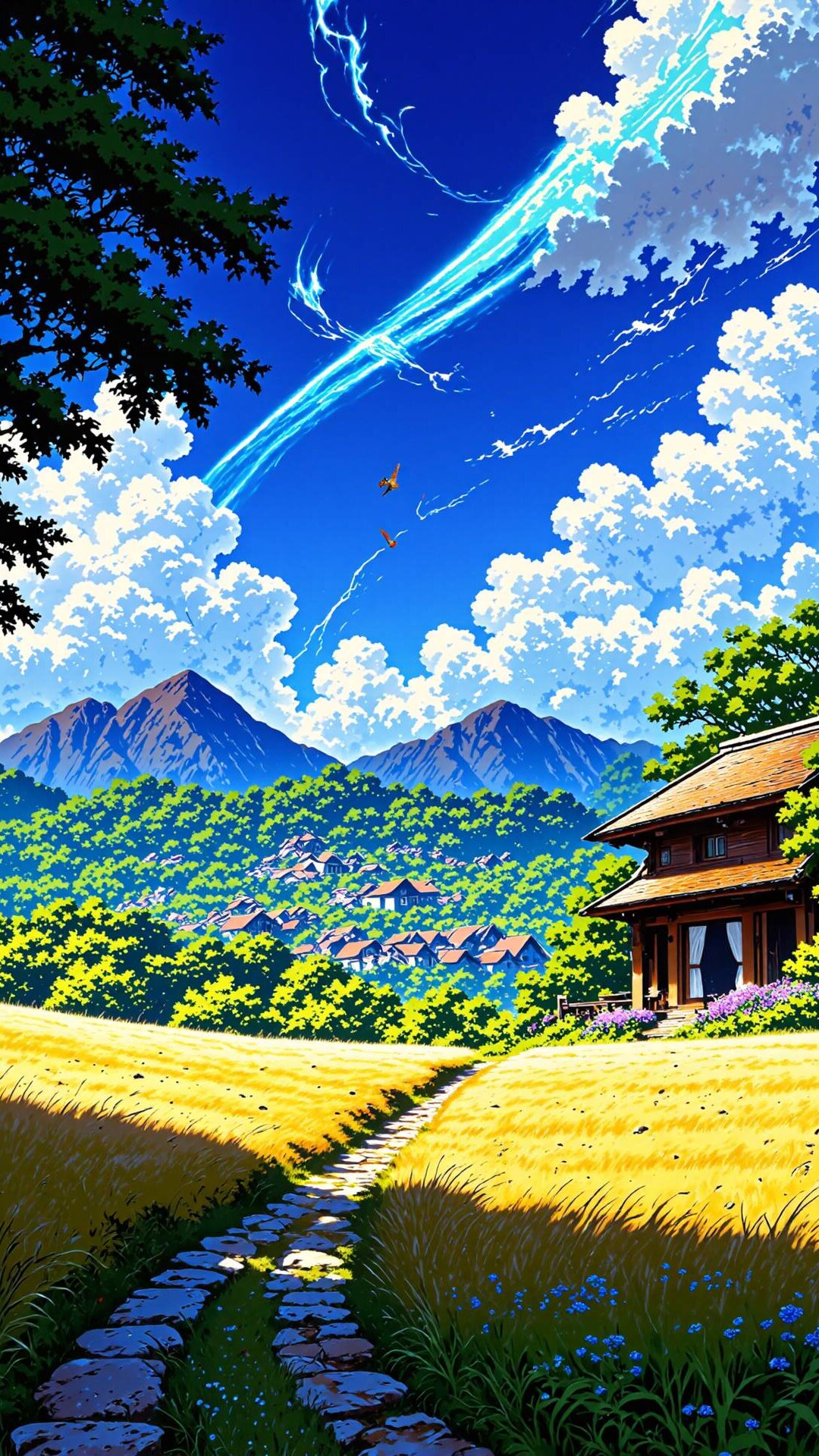 Experience the ultimate getaway with this vibrant depiction of a heavenly landscape. The path winds through golden fields towards majestic, towering mountains under dramatic, celestial clouds. This scene radiates an epic adventure vibe, perfect for capturing a sense of nostalgic tranquility. The clear lighting suggests a bright, perfect day, making it a stunning Blissful Scapes piece and an ideal fit for mobile home screens.