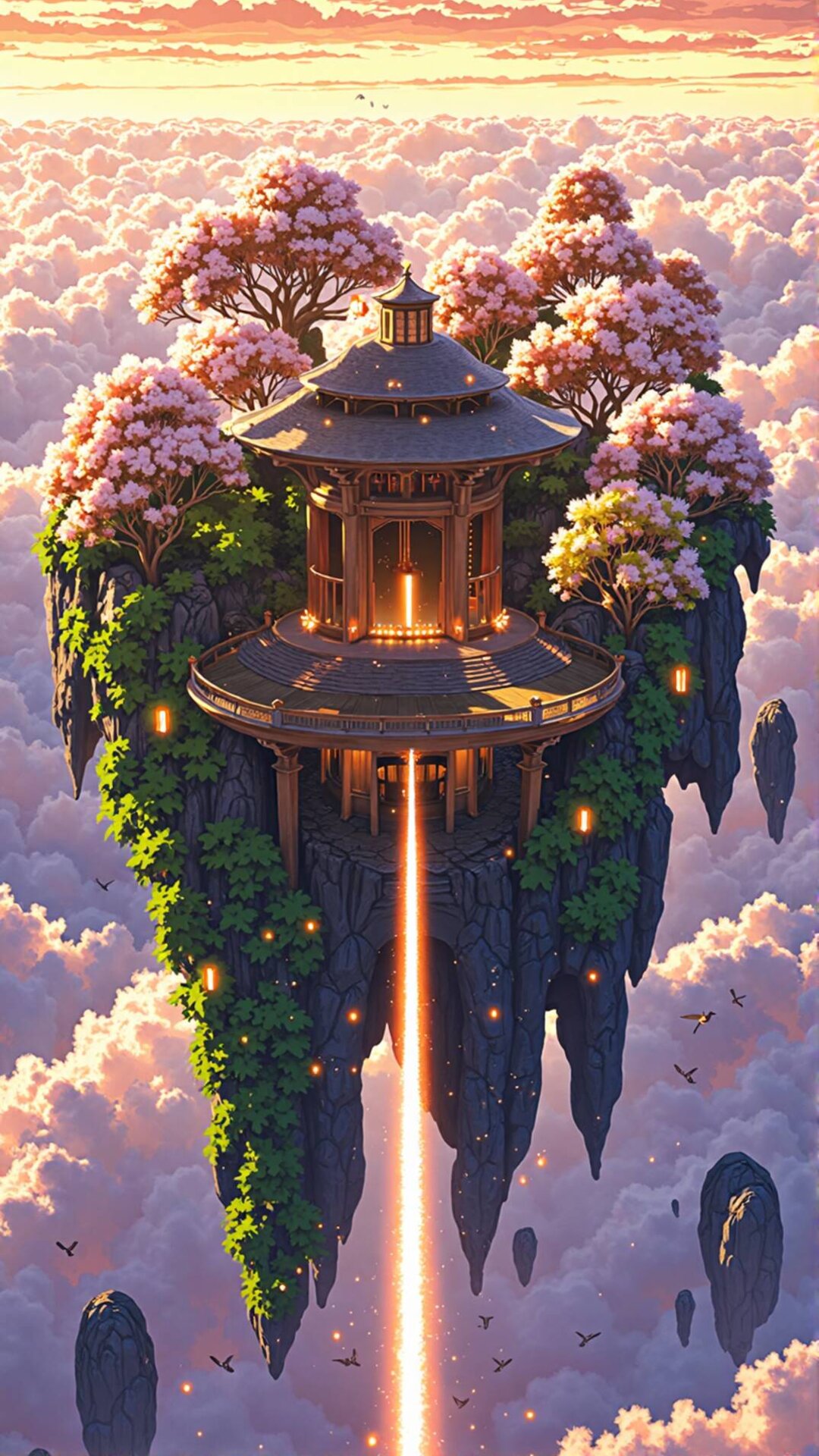 This stunning artwork for Blissful Scapes captures a magical scene: a serene pagoda nestled on a lush, floating island, surrounded by vibrant pink blossoms and soft, dramatic clouds. The golden hour lighting illuminates the central, glowing waterfall, creating a mystical and peaceful vibe. It is a perfect fit for mobile home screens, evoking a sense of epic adventure and tranquil wonder.