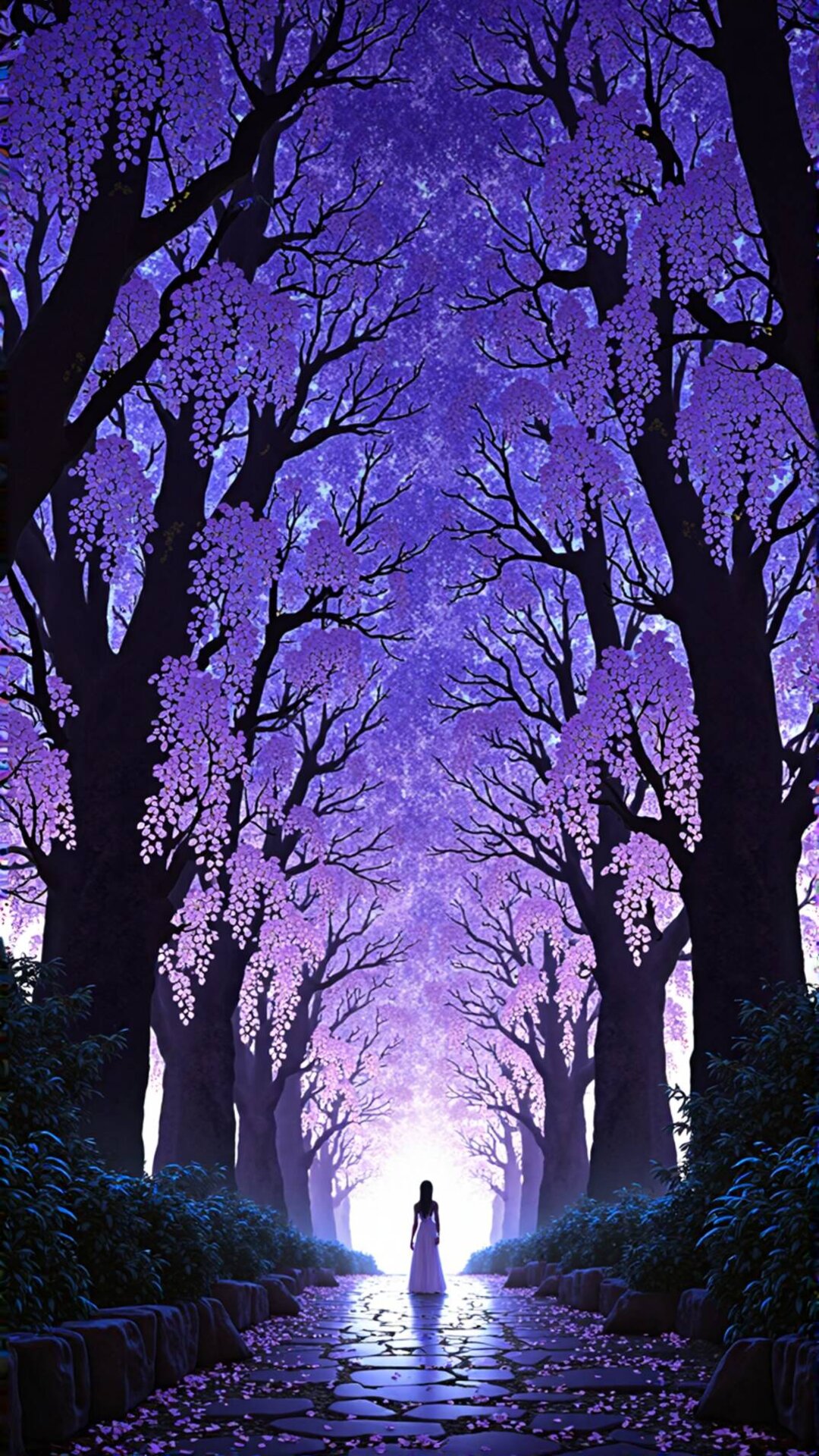 Step into this ultimate dreamscape featuring a dramatic path illuminated by a profound purple glow. The scene is framed by majestic, blossoming cherry trees, creating a canopy of vibrant color. This image evokes a profoundly magical and nostalgic vibe, perfect for capturing a sense of ethereal wonder. Blissful Scapes captures the soft, almost starlit lighting that guides the viewer down the path, making it an ideal fit for mobile home screens.