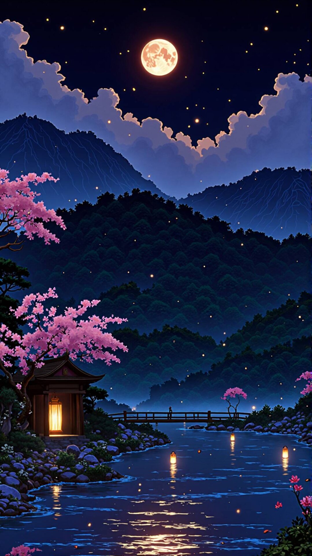 Experience the serene beauty of this stunning scene, a perfect 'Blissful Scapes' moment. This breathtaking artwork captures a tranquil Asian nightscape with luminous cherry blossoms, a glowing temple, and dramatic full moon over deep, lush mountains. The starlit lighting reflects softly on the still water, evoking a deeply nostalgic and peaceful vibe. It is a captivating visual designed to be a perfect fit for mobile home screens.
