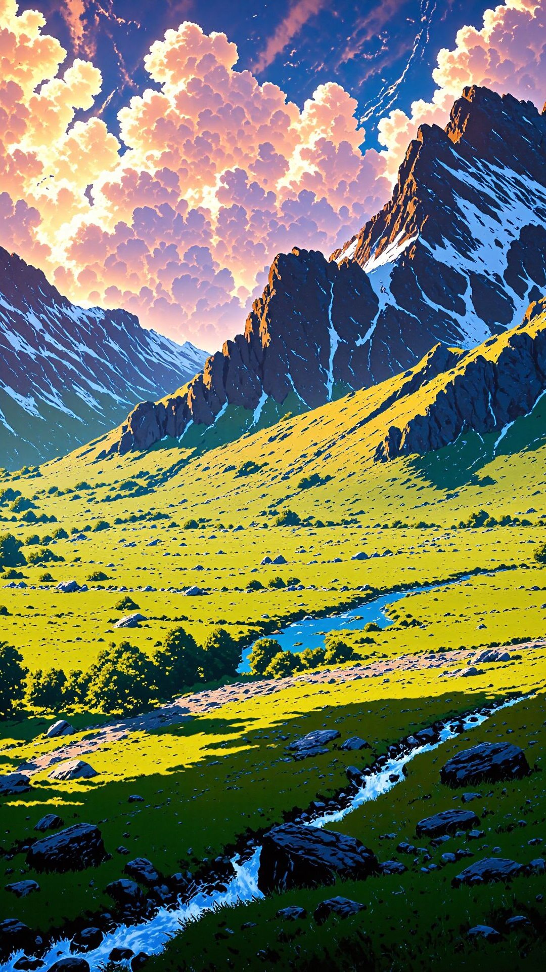 This epic 'Blissful Scapes' captures a sweeping view of golden fields nestled between colossal, jagged mountains. The lighting suggests a perfect golden hour, illuminating dramatic, richly colored clouds overhead. A tranquil stream meanders through the vibrant green foreground, giving the scene an adventurous and breathtaking vibe. It is a perfect fit for mobile home screens.