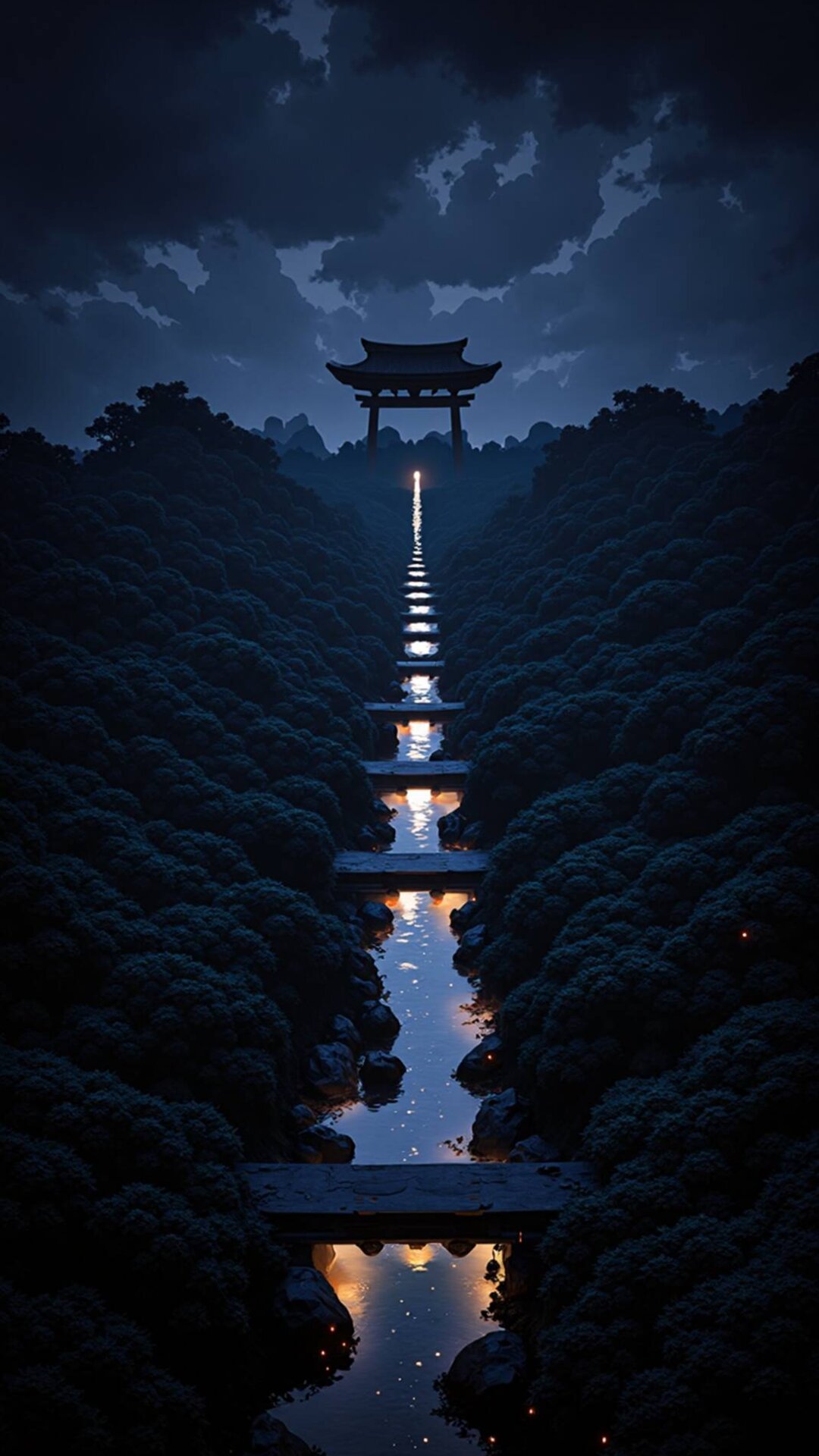 Step into the deep tranquility of this magical scene, a perfect fit for mobile screens. The winding path reflects the glow of the distant temple under dramatic, moody clouds. This image embodies 'Blissful Scapes,' offering a deeply nostalgic and serene vibe, evoking a sense of epic journey. The contrast between the dark, dense foliage and the illuminated path creates a breathtaking visual experience.