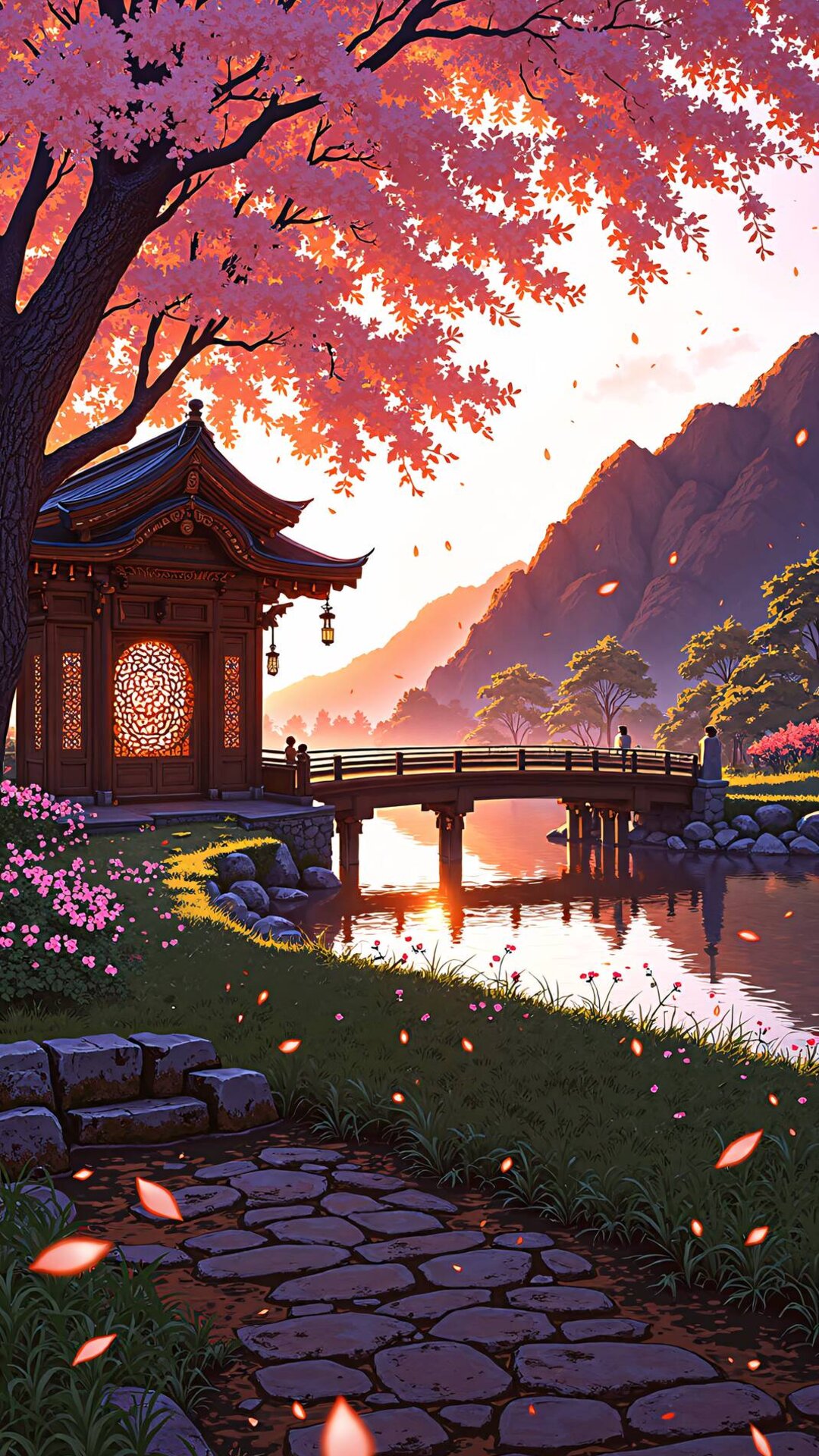 Experience the serene beauty of this Blissful Scapes image. It captures a traditional Japanese temple and arched bridge set against a stunning mountain backdrop during golden hour. The vibrant autumn leaves and the tranquil water create a deeply nostalgic and peaceful vibe. This detailed, cinematic scene is a perfect fit for mobile home screens, making every glance an escape.