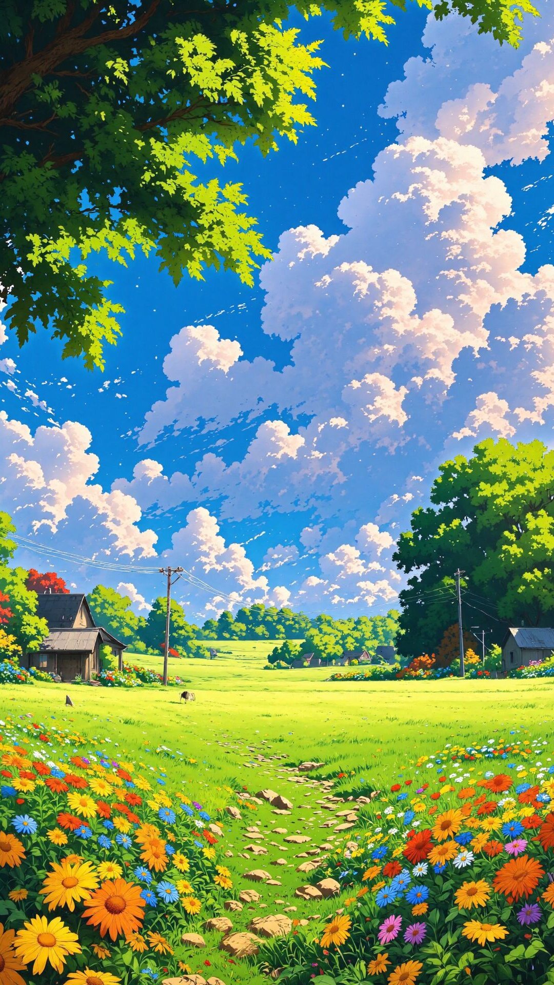 This stunning meadow scene captures pure pastoral bliss, making it a perfect fit for mobile home screens. The foreground bursts with colorful wildflowers, leading to a green path under a bright blue sky filled with dramatic, fluffy clouds. The overall vibe is wonderfully nostalgic and peaceful, evoking a perfect summer day. This idyllic setting is a prime example of Blissful Scapes, celebrating the rich colors and tranquility of nature. The lighting suggests late afternoon, giving the whole scene a warm, sun-drenched glow.
